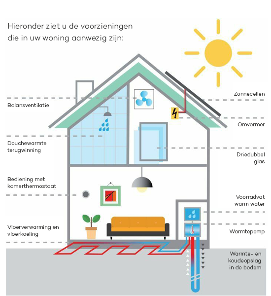 U heeft een warmtepomp in huis. Deze zorgt voor een aangename temperatuur en warm water. De warmtepomp haalt warmte uit de bodem en stuurt die naar de vloerverwarming en de boiler. Daar wordt het water verder opgewarmd tot de gewenste temperatuur.